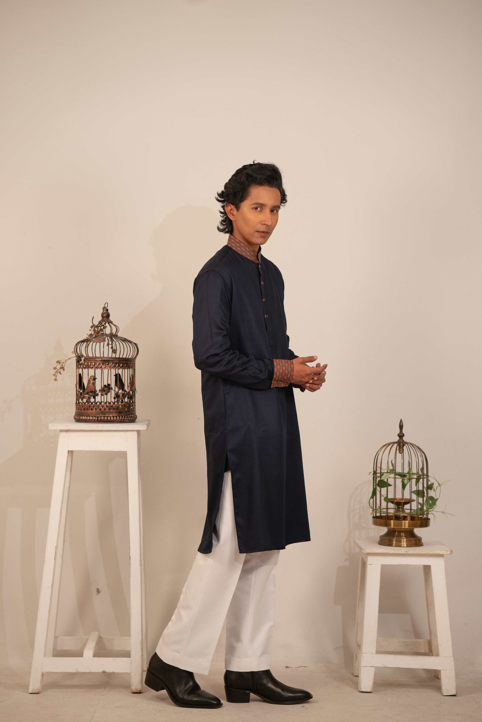 Mandarin collar highlighted with contrast textured fabric in a warm brown tone, adding depth and a heritage-inspired touch.